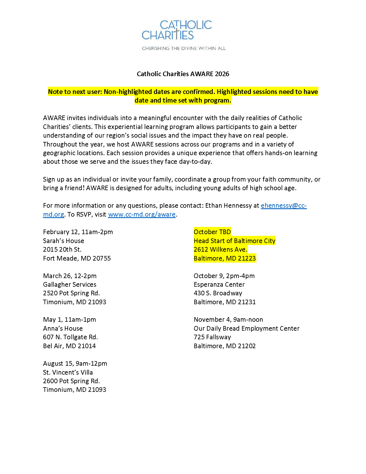 Throughout the year, AWARE sessions are offered at a variety of different Catholic Charities sites across the Baltimore region. Each session is unique and highlights a particular area of service and justice. AWARE sessions explore hunger and homelessness, aging, early childhood education & family strengthening, mental health in childhood, immigration, and disability.